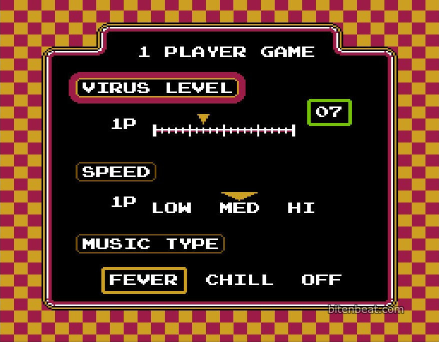 Before starting a match, the player can adjust the number of viruses, the speed at which vitamins fall, and the background music.
