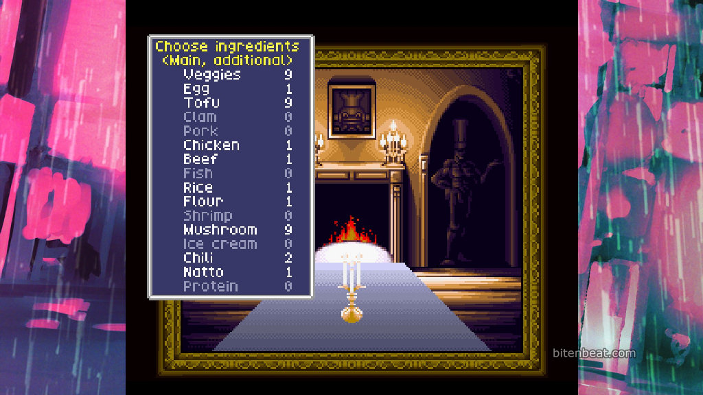 It’s creative in some aspects: when you defeat an enemy, they drop an ingredient (which can restore a small percentage of your HP). After defeating a boss, you choose two ingredients collected during the stage to create a dish. That dish restores a percentage of your HP for the next stage.