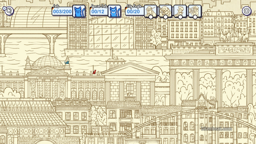 As you find cats, parts of the scene gradually become colored. Along with this, there are characters and illustration elements with small movements, making the game feel more dynamic. Additionally, cards with curiosities about Berlin are displayed, as well as extra scenarios that are unlocked.