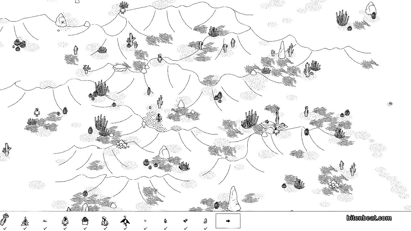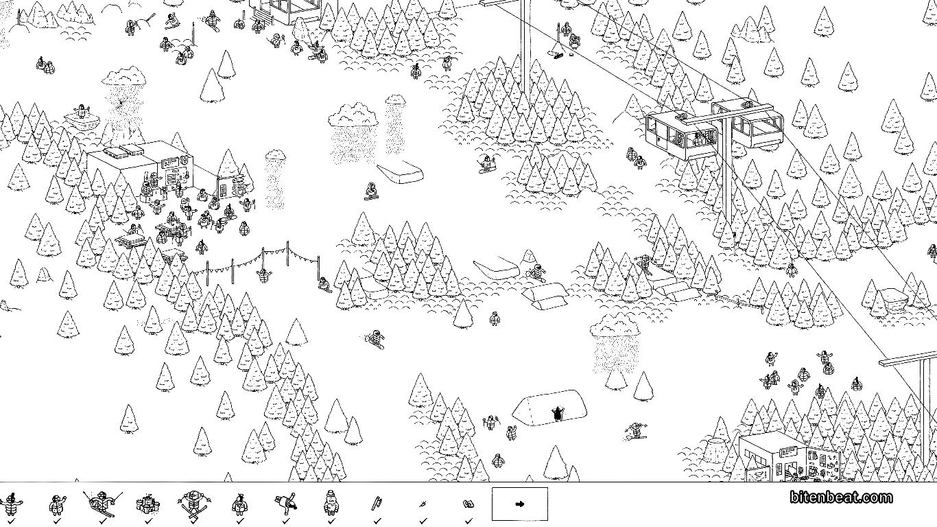 Hidden Folks gameplay in a forest with many campsites. Hidden Folks gameplay in a storage room. An early level in Hidden Folks. A city full of buildings in Hidden Folks. A desert stage from Hidden Folks. A snow-themed level from Hidden Folks.