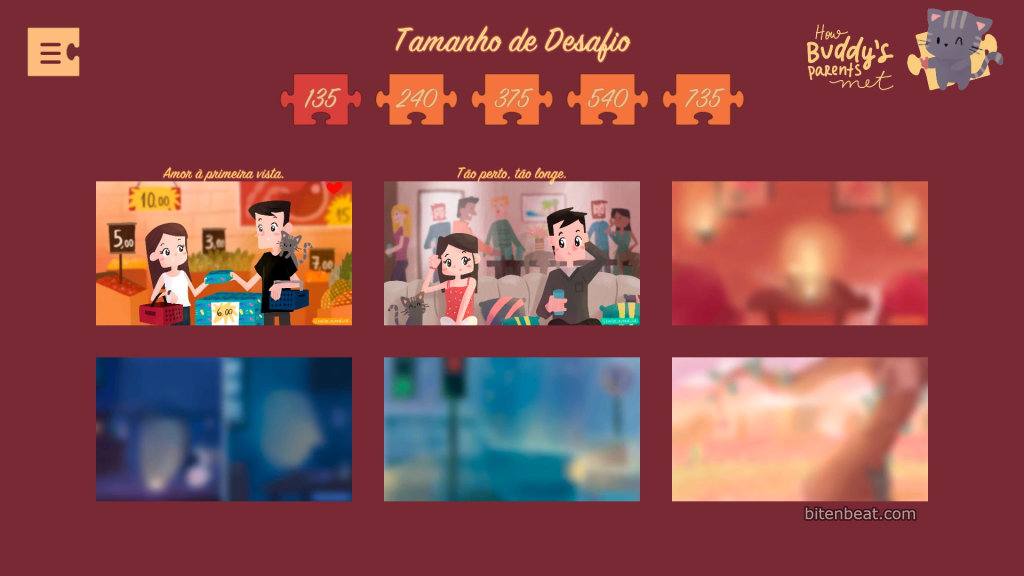 A jigsaw game in which each illustration shows how Buddy (the cat) and his parents met.