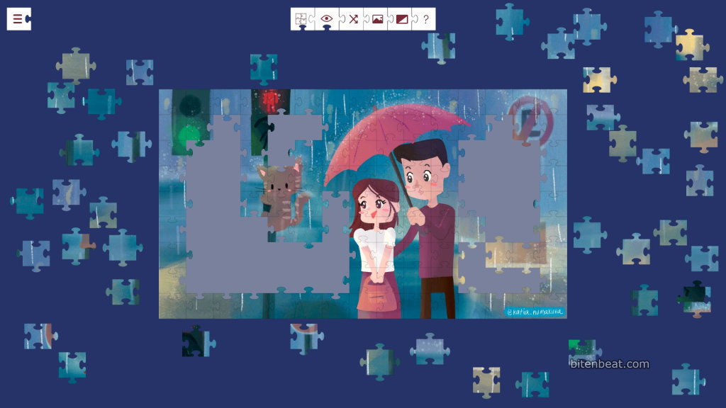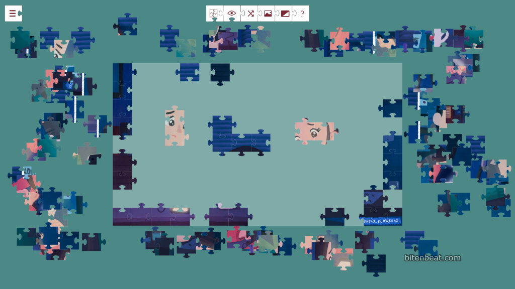 You can preview the full illustration while positioning the pieces, which helps you determine whether you’re placing them in the right area. You can also shuffle the pieces. That option doesn’t make much difference with 135 pieces, but at higher difficulty levels, it becomes quite useful when trying to find specific sections of the image.