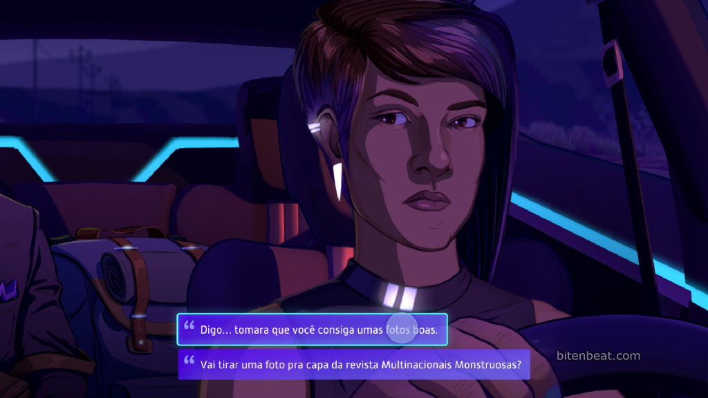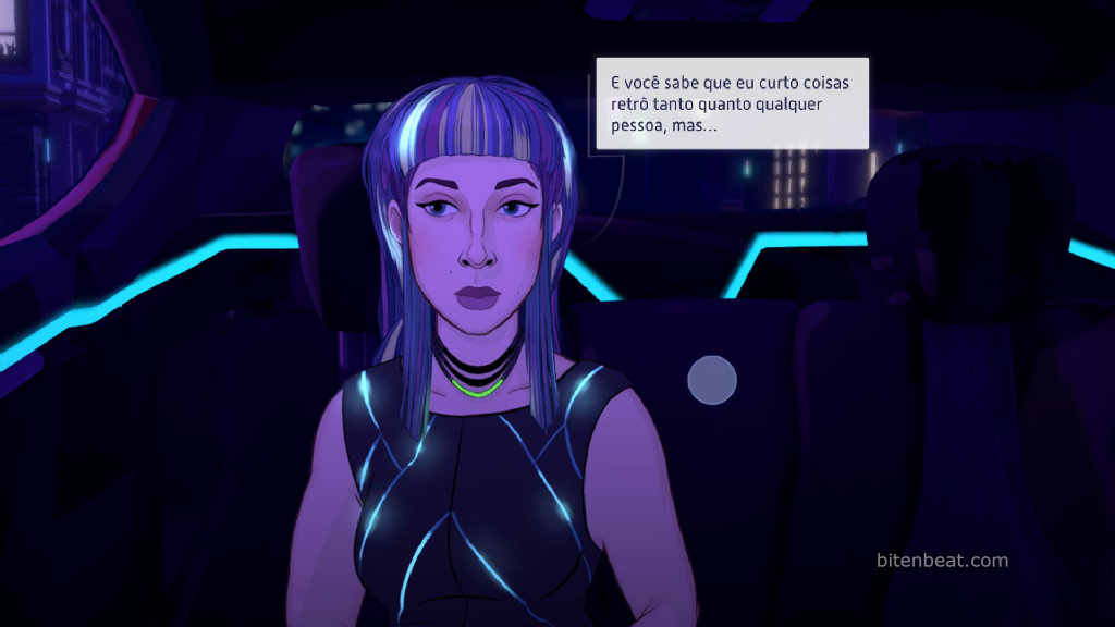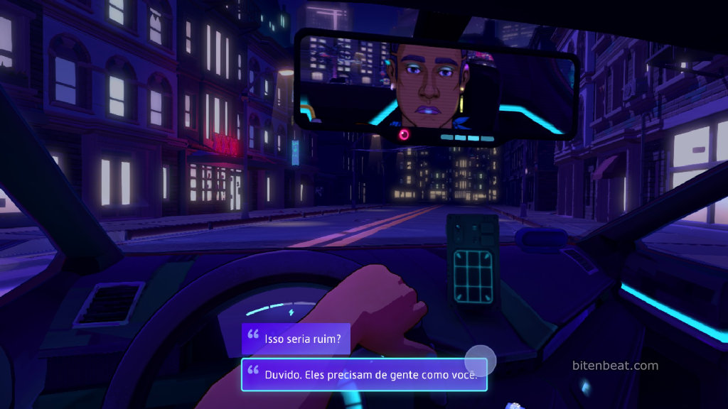 Neon Cab is a narrative game that tells a bit about Lina’s daily life as a driver in a cyberpunk world. In addition to dealing with her work routine, Lina interacts with passengers of all kinds, from friendly to problematic.
