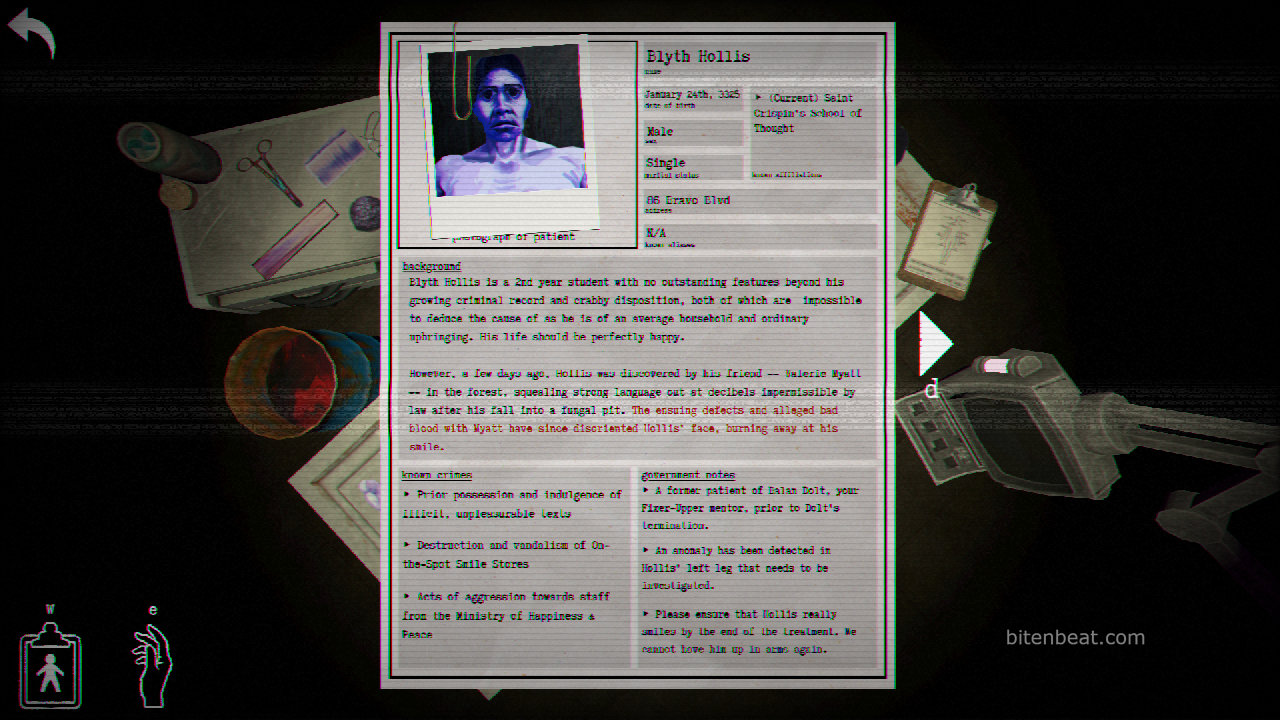 You play as a surgeon who must “fix” patients, making them perfect and happy. After finishing your work, you send a report to the Ministry of Happiness & Peace. Everything you do is based on the orders of this entity.
