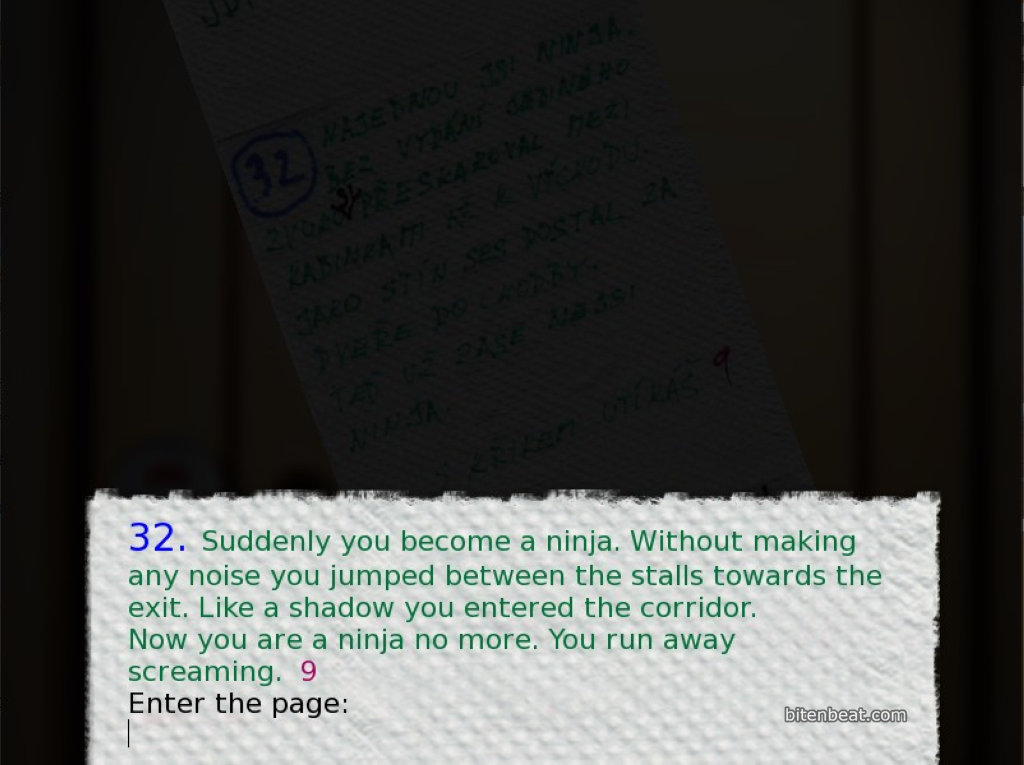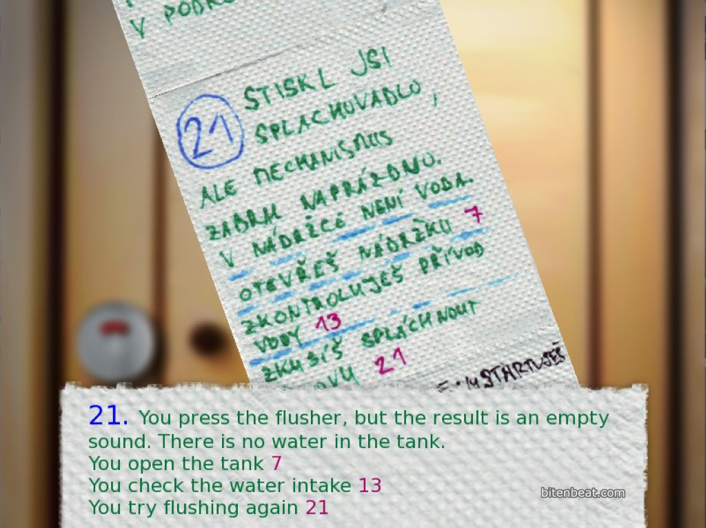 You sit down on the toilet and let out something really massive. After finishing, you realize there isn’t enough toilet paper, and what little you have left is completely covered in scribbles (with game instructions on it!).