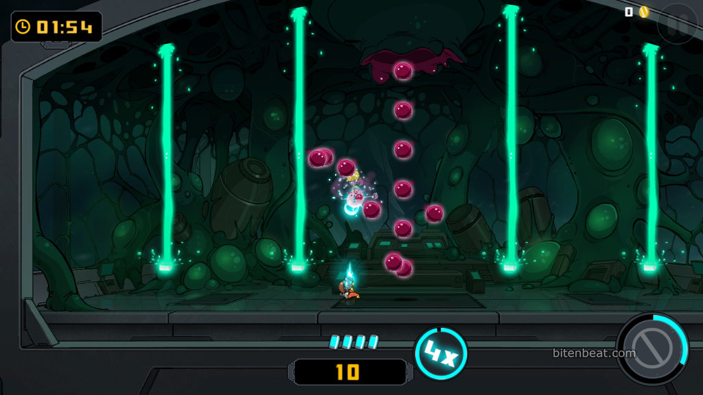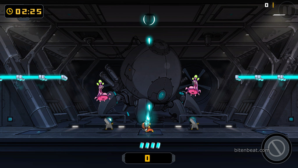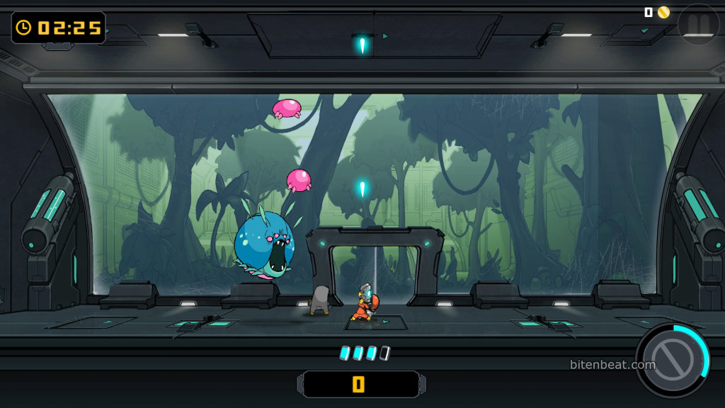 Panic mode is also divided into six stages, but without stages. It’s an endless mode where, besides killing aliens, you must collect clocks that add more time to keep playing. When your life or time runs out, the game ends.
